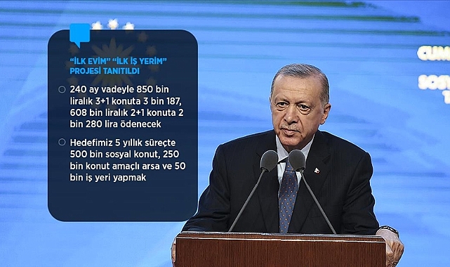 Cumhurbaşkanı Recep Tayyip Erdoğan, projelerin, yatay mimari esasıyla, zemin artı 3, zemin artı 4 veya zemin artı 5 olarak, depreme dayanıklı şekilde inşa edileceğini de aktardı. Erdoğan, "Projelerimizi, özellikle mahalle kültürünü, komşuluk ilişkilerini gözetecek, yeşili hakim kılacak bir anlayışla hayata geçiriyoruz. Her şeyden önce bu gerçeğin altını özellikle çizmek istiyorum, bu kampanya, sayısı ve kalitesi bakımından dünyadaki en büyük konut yatırımını ifade etmektedir. Cumhuriyetimizin 100'üncü yılına böyle küresel ve tarihi önemde bir kampanyayla girmekten gurur duyuyoruz." diye konuştu.Kampanyayla ilgili ayrıntıları paylaşan Erdoğan, "Hedefimiz, 81 ilimizde ve tüm ilçelerimizde 2023-2028 arasını kapsayan 5 yıllık süreçte 500 bin sosyal konut, 250 bin konut amaçlı arsa, 50 bin iş yeri yaparak milletimizin istifadesine sunmaktır." ifadelerini kullandı."Böylece, 2003 başından itibaren ürettiğimiz sosyal konut sayısını 2 milyona, diğer projelerle birlikte bunların içerisinde oturan vatandaş sayımızı da 10 milyonun üzerine çıkarmış olacağız." diyen Erdoğan, projenin ve bu kapsamda yapılacak konutlar ile iş yerlerinin ismini ise "İlk Evim, İlk İş Yerim" olarak belirlediklerini söyledi.Cumhurbaşkanı Erdoğan, şunları kaydetti:"Tanıtımını yaptığımız 500 bin konut hedefi sayısı, iş yerleriyle birlikte düşünüldüğünde hane sayısı bakımından İstanbul'un dörtte birine, Ankara'nın yarısına, Kocaeli'nin tamamına eşitken, Bilecik, Bitlis, Bolu, Bingöl, Burdur, Çankırı, Erzincan, Gümüşhane ve Hakkari'nin tamamına eşittir. Bu büyüklükteki bir proje, yaklaşık 900 milyar liralık yatırım değeri demektir. Çarpan etkisiyle 2 trilyon liradan fazla ekonomik hareketliliğe yol açacak, bir projeyi bugün değerli vatandaşlarımla birlikte paylaşıyoruz. Böylesine devasa bir yatırımın ülkenin tamamında ev ve kira fiyatlarını düşüreceği gibi vatandaşlarımızın konuta erişimini de kolaylaştıracaktır. Esasen Türkiye, Avrupa ve Amerika gibi yerlerle kıyaslandığında konut sahipliği oranının en yüksek olduğu ülkelerin başında gelmektedir."Bu kampanyanın, özel sektör yatırımlarında yol açacağı hareketlilikle değerlendirildiğinde, Türkiye'deki konut sahipliği oranını daha da artıracağına işaret eden Erdoğan, "'Dünyada mekan, ahirette iman' diyen bir millete yapılabilecek en büyük hizmetin bu olduğuna inanıyorum." diye konuştu.