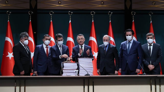 Kovid-19 salgınıyla artan küresel belirsizliklerin tüm dünyada üretimi, istihdamı ve sermaye dolaşımını olumsuz yönde etkilemeye devam ettiğinin altını çizen Oktay, birçok ülke ekonomisinin küçüldüğü geçen yıl, krizi fırsata çevirecek araçları kamuya sağlayan yapıda bir bütçe hazırladıklarını ve yıl boyunca tüm kurumların kaynakları en etkin ve verimli şekilde kullandıklarını anlattı.Fuat Oktay, "Büyüme oranlarımızdan ihracat rekorlarına, sanayi üretimindeki artıştan cari açığımızdaki iyileşmeye kadar pek çok gösterge, Kovid-19 salgınına rağmen Türkiye’nin yoluna güçlenerek devam ettiğini ortaya koymaktadır." diye konuştu.Geçen yıl gerçekleştirilen yüzde 1,8'lik büyüme ivmesinin 2021'in ilk çeyreğinde yüzde 7,2 ve ikinci çeyreğinde yüzde 21,7 oranında büyüme oranlarıyla devam ettirildiğini anımsatan Oktay, sözlerini şöyle sürdürdü:"İhracatımız, Cumhuriyet tarihimizde yeni bir rekora daha imza atarak, yıllık bazda 212 milyar dolar seviyesine ulaşmıştır. Bunların yanında, hastaneler, otobanlar, demir yolları, köprüler, tüneller, barajlar, içme suyu ve sulama tesisleri, organize sanayi bölgeleri, AR-GE merkezleri, salgın destekleri ve yerli aşı projesi, enerji ve savunma sanayi projeleri gibi sayısız yatırımı içinde bulunduğumuz bütçe döneminde hayata geçirdik. Yeni yatırımlarımıza salgın döneminde de hız kesmeden devam ettik, ediyoruz."Bu başarıda maliye politikasının güçlü bir biçimde kullanılmasının önemli ölçüde etkili olduğunu belirten Oktay, "2022 bütçe teklifini de kovid salgınının artçı sarsıntılarına rağmen güçlenen, kalkınan ve büyüyen Türkiye vizyonuyla hazırladık. Hazırlanan bütçe teklifi; kalkınma hedeflerimiz, ülkemizin refahını artırma gayretimiz ve istikrarımızın dayanağını oluşturmaktadır." ifadesini kullandı.Bütçenin, tüm sektörleri yatay kesen yeşil dönüşümü odağına alarak karbon nötr yatırımları ve süreçleri destekleyen, yeşil ekonomiye geçiş sürecini hızlandıracak nitelikte olduğunu vurgulayan Oktay, şöyle devam etti:"Bu yaklaşımla sadece emisyon azaltıcı değil aynı zamanda yutak alanların artırılmasını sağlayan projeleri hayata geçireceğiz. En etkin ve modern izleme ve denetleme sistemlerini kurarak çevresel tahribatı azaltacak, sürdürülebilir üretim ve tüketimi destekleyeceğiz. Yeşil büyüme yaklaşımımızla afet riski altında bulunan yapıların ve alanların dayanıklılığını artırarak, kentsel altyapıyı iyileştirecek, su kaynaklarının uygun kullanımı ve yönetimini daha da geliştireceğiz. Söz konusu yatırımlarda, ülkemizin bu konuda benimsediği ulusal stratejiler ile Sürdürülebilir Kalkınma Amaçları gibi uluslararası taahhütleri de gözeteceğiz. İnsanımızı merkeze alan bir icraat bütçesi olan 2022 yılı bütçesi, yeşil kalkınma devrimi ve milli teknoloji hamlesi gibi milli hedeflerimizde bir kilometre taşı olacaktır. 2022 bütçesi, yapay zeka ekosistemine değer üreten, araştırma, girişimcilik ve inovasyonu destekleyen, milli uzay programını adım adım hayata geçiren ve yenilenebilir enerji altyapısını güçlendiren Türkiye'nin yenilikçi ve çevreci bütçesidir."Fuat Oktay, sağlıktan eğitime, güvenlikten ulaştırmaya, sanayiden ekonomiye, kadının güçlendirilmesinden sosyal yardımlara kadar her alanda Cumhurbaşkanı Erdoğan'ın liderliğinde somut ve dinamik politikaları, bütçe temelinde birer birer uygulamaya geçirmeye devam edeceklerini bildirdi.