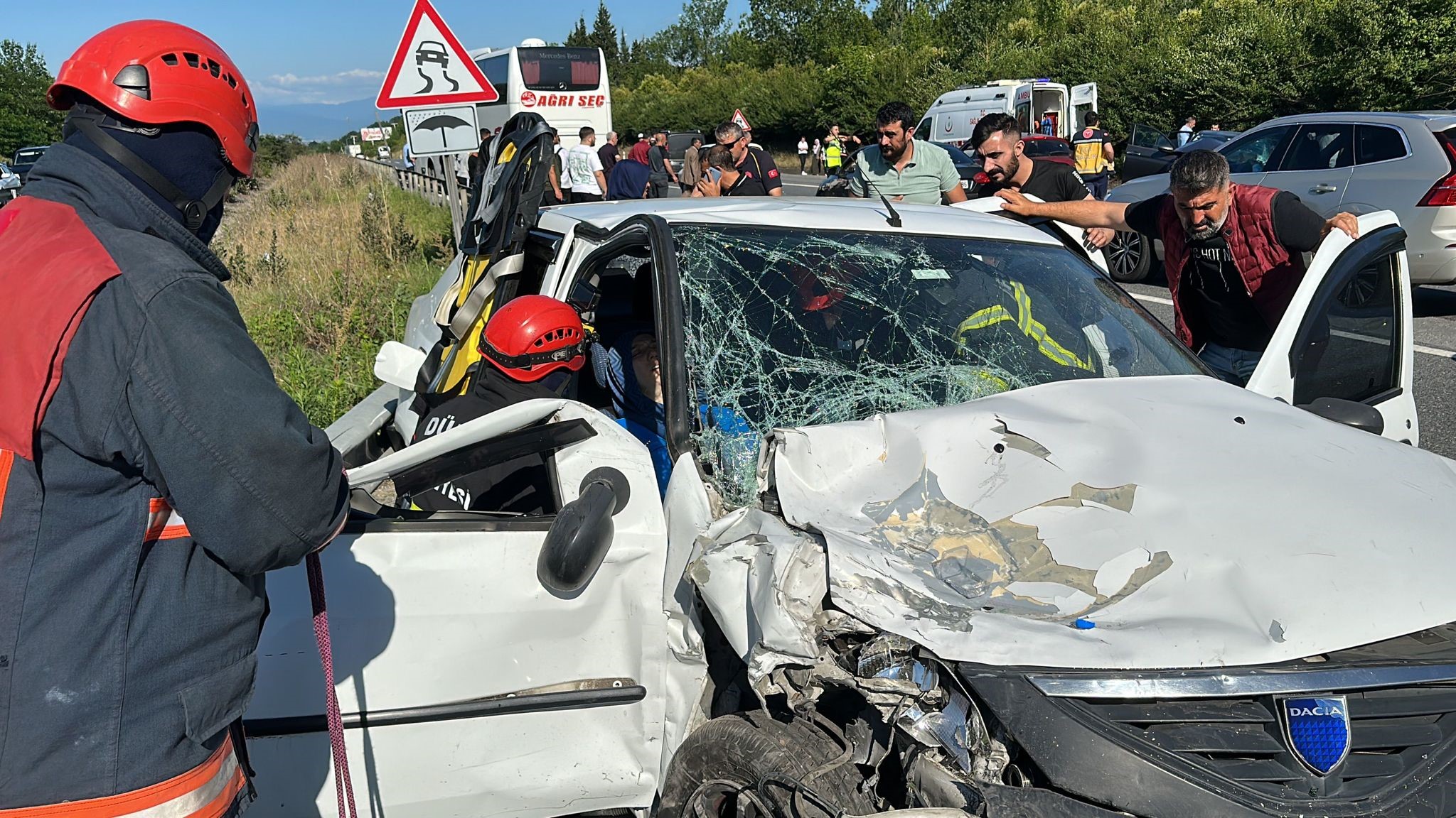 Edinilen bilgilere göre, İstanbul'dan Ankara istikametine seyir halinde olan 41 AFR 430 plakalı otomobil, aynı istikamette seyir halinde olan 34 UT 9377 plakalı otomobile ve İstanbul'dan Ağrı'ya yolcu taşıyan 34 VSG 04 plakalı otobüs kazaya karıştı.