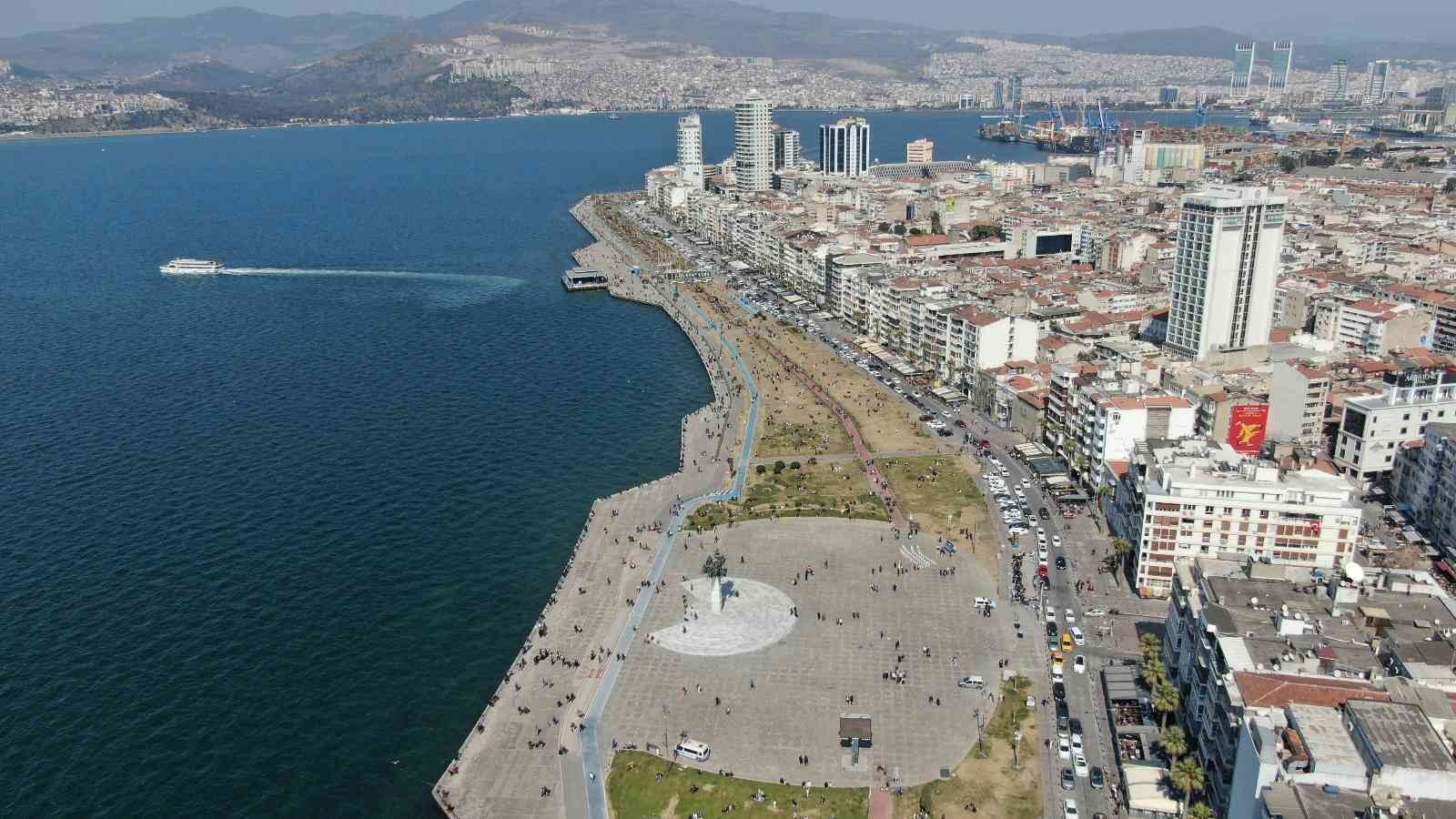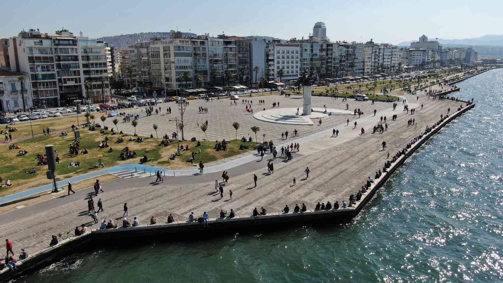 Uzun süredir mevsim normallerinin altında seyreden sıcaklıklar, bu hafta ortasından itibaren yükselişe geçti. Havaların ısınmasıyla birlikte vatandaşlar kendilerini dışarı attı. İzmir'in en gözde yerlerinden biri olan Kordonboyu'nda da yoğunluk yaşandı. Sıcaklığın yükselmesini değerlendiren vatandaşlar, arkadaşlarıyla, aileleriyle veya evcil hayvanlarıyla Kordon'a geldi. Bazı vatandaşlar sahil şeridinde yürüyüş yaparken, bazıları da çimlerde oturmayı tercih etti. Kimi vatandaşlar ise balık tutmak için oltalarını denize attı. Kordonboyu'nda oluşan yoğunluk havadan görüntülendi.