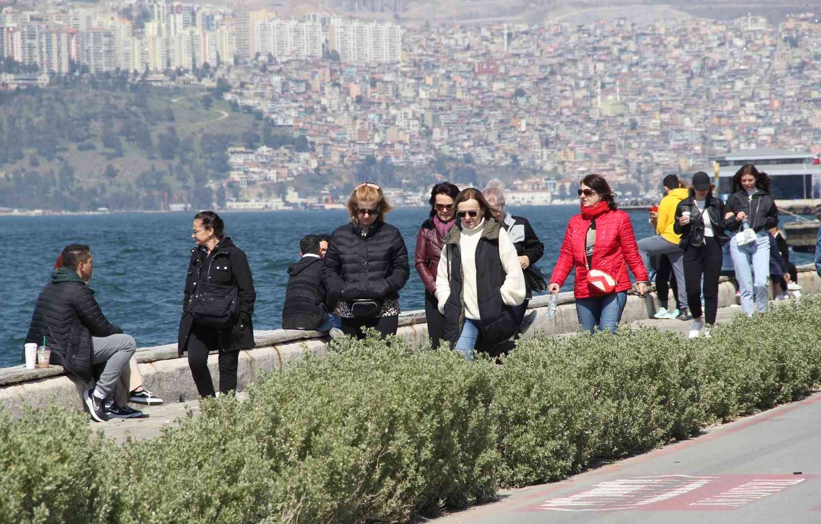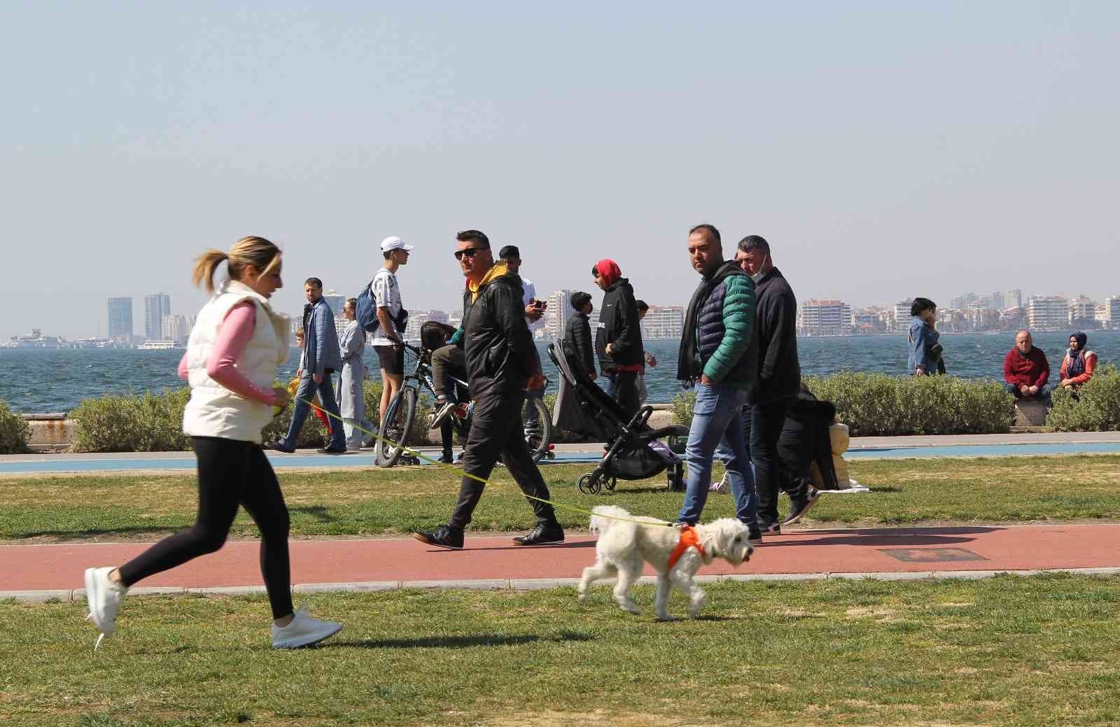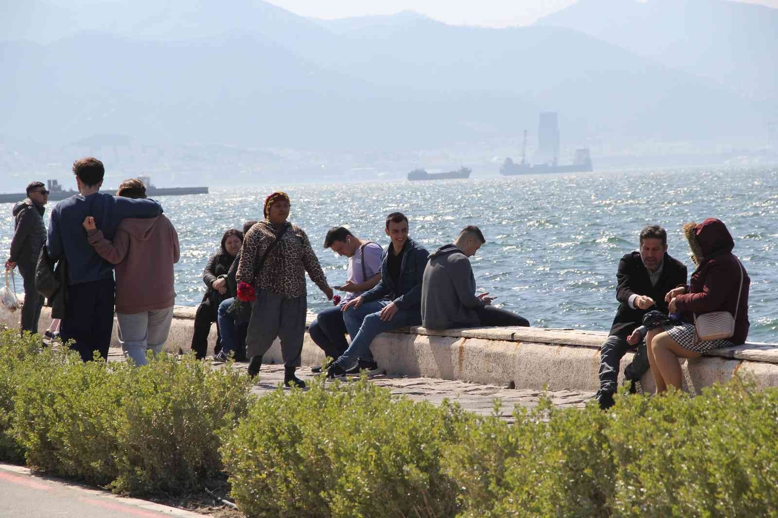 İzmir'de yükselmeye başlayan hava sıcaklığıyla birlikte vatandaşlar Kordonboyu'na akın etti. Bazı vatandaşlar deniz kenarında yürümeyi tercih ederken, bazıları da çimlerde oturarak sıcak havanın tadını çıkarttı.