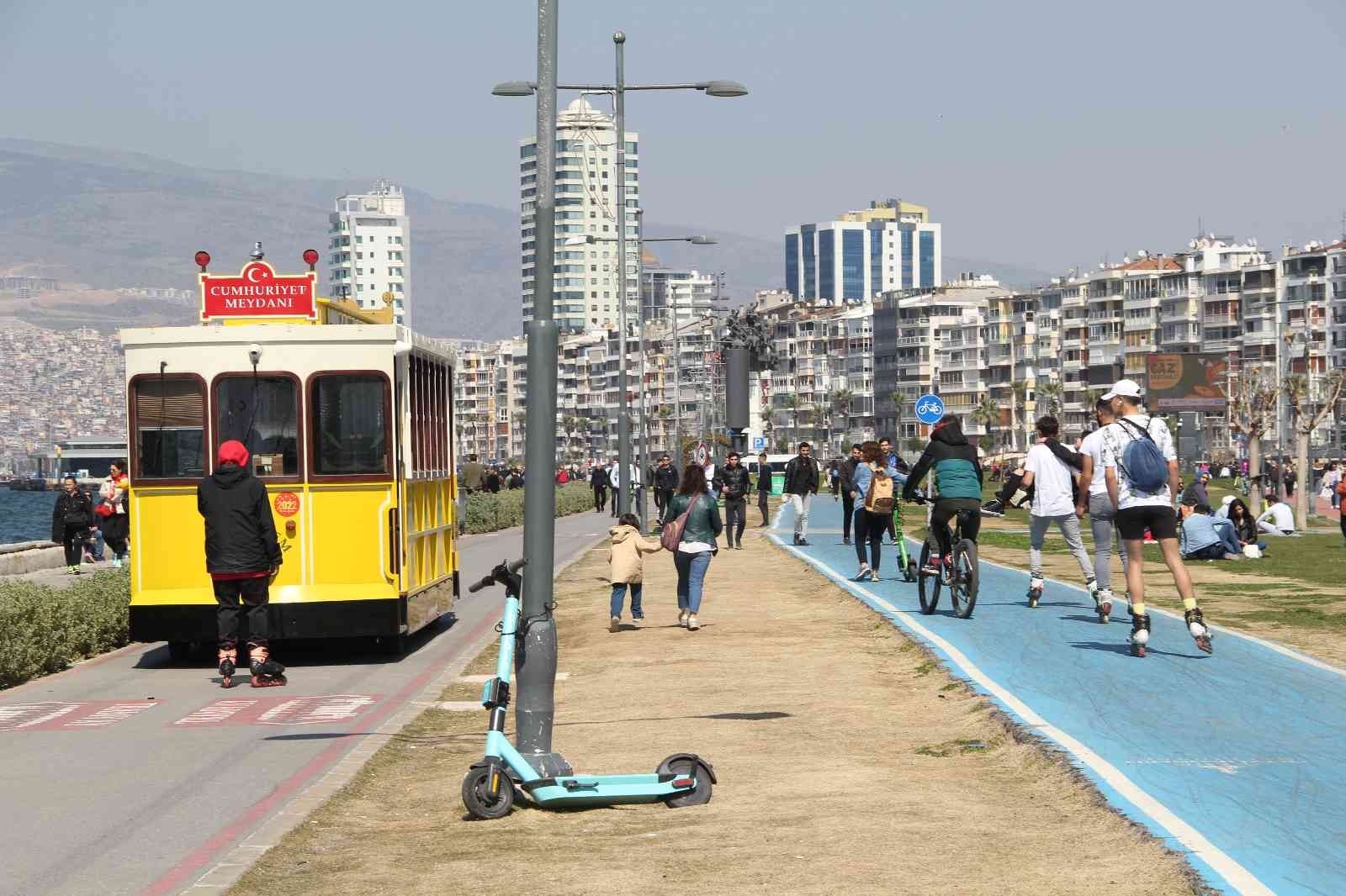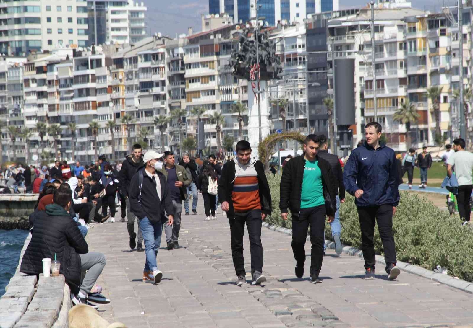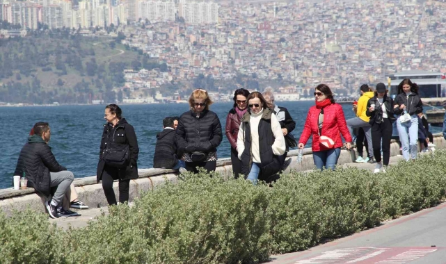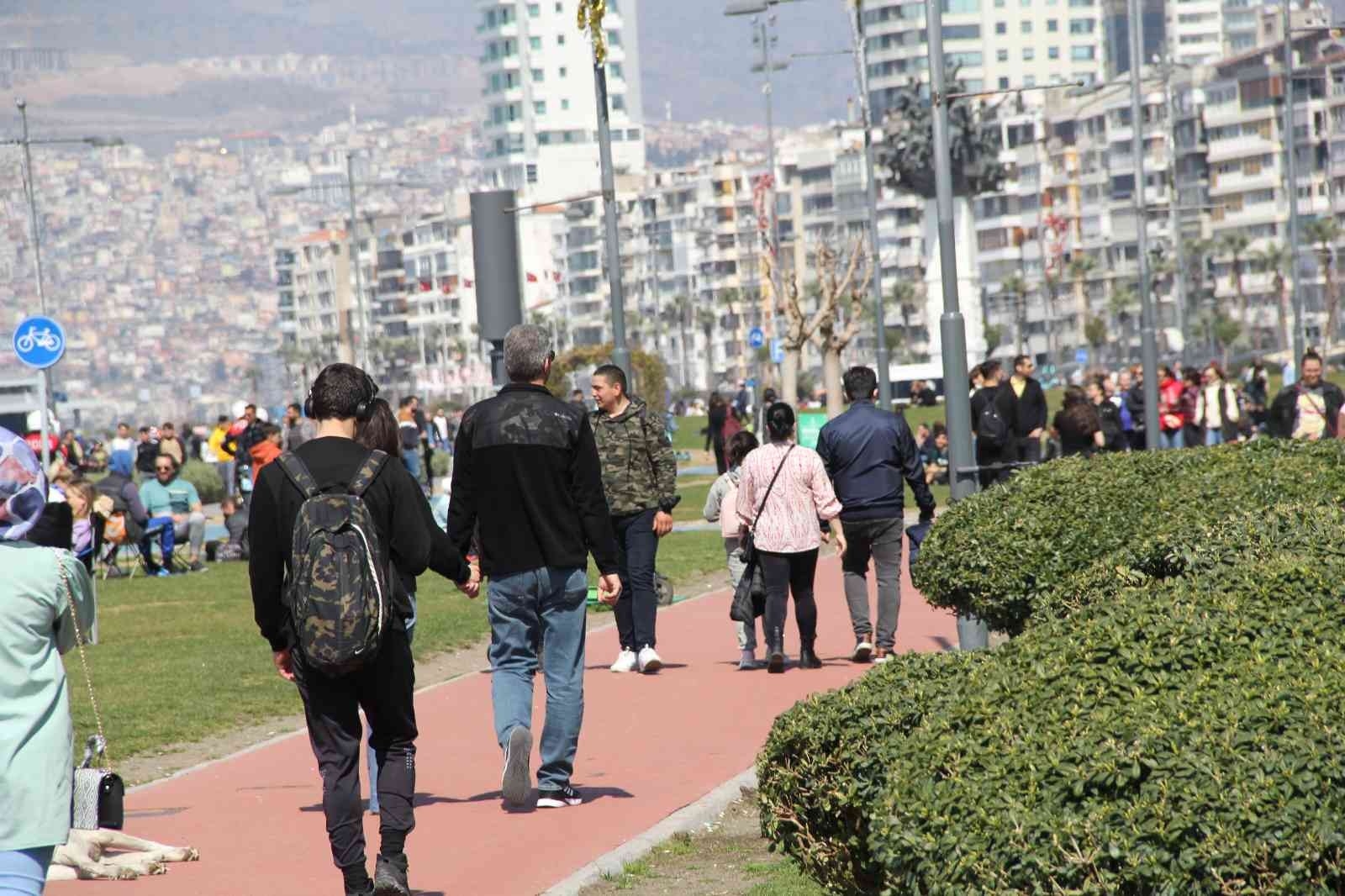 İzmir'de yükselmeye başlayan hava sıcaklığıyla birlikte vatandaşlar Kordonboyu'na akın etti. Bazı vatandaşlar deniz kenarında yürümeyi tercih ederken, bazıları da çimlerde oturarak sıcak havanın tadını çıkarttı.